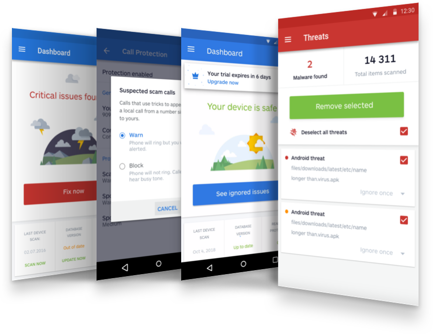 화면 잠금 장치(Screen Lockers)와 애드웨어 같은 원치 않는 프로그램이나 멀웨어를 빠르고 효과적으로 검색하여 Android 기기를 블로트웨어(Bloatware)에서 보호합니다.