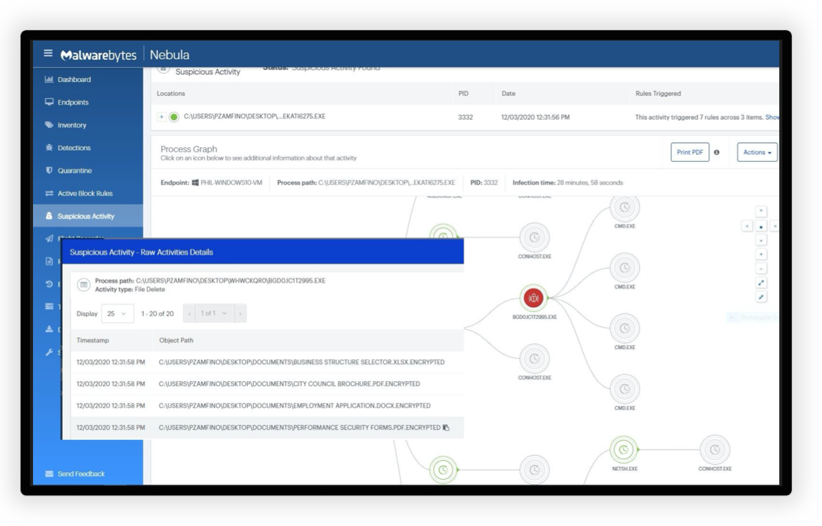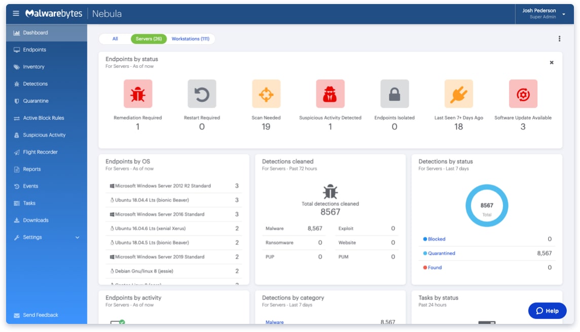 클라우드 기반의 Malwarebytes Nebula 플랫폼으로 제한된 리소스를 최대한 활용하십시오. 한 개의 창과 직관적인 UI를 통해 조직의 모든 활동에 대한 가시성을 확보할 수 있습니다. 엔드포인트를 쉽게 관리하고, 위협을 탐지하며, 클릭 한 번으로 서버와 워크스테이션을 안전하고 생산적으로 유지할 수 있습니다. 고객 서버를 보호하는 MSP는 Malwarebytes OneView 콘솔을 사용하여 동일한 이점을 누릴 수 있습니다.