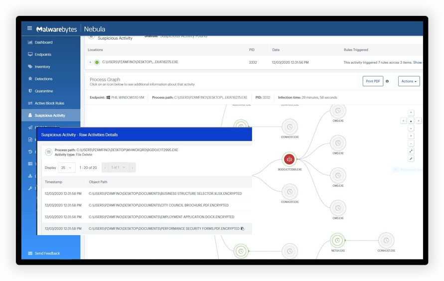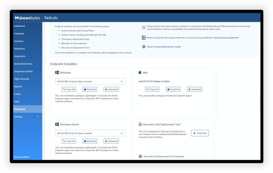 클라우드 기반의 Malwarebytes Nebula 플랫폼으로 제한된 리소스를 최대한 활용하십시오. 단일 창과 직관적인 UI를 통해 조직 전체의 모든 활동에 대한 가시성을 확보할 수 있습니다. 엔드포인트를 쉽게 관리하고, 위협을 탐지하고, 클린 한 번으로 서버와 워크스테이션을 안전하고 생산적으로 유지할 수 있습니다. 고객 서버를 보호하는 MSP는 Malwarebytes OneView 콘솔을 사용하여 동일한 이점을 누릴 수 있습니다.