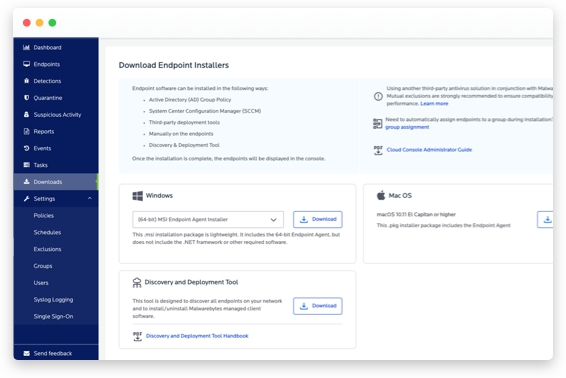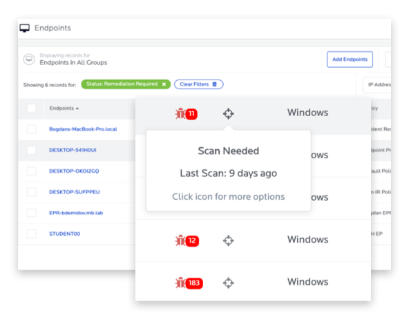 클라우드를 통해 교묘한 활동을 중단시키는 Malwarebytes 에이전트로 엔드포인트 프로세스가 간편합니다.