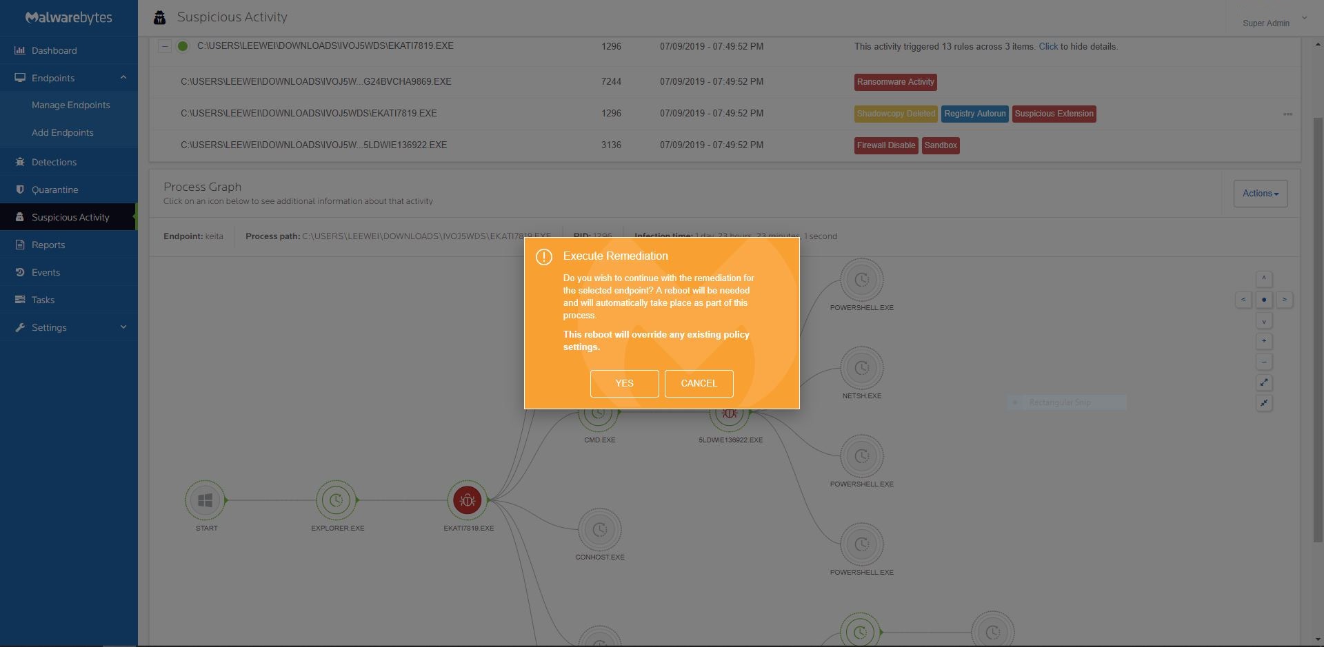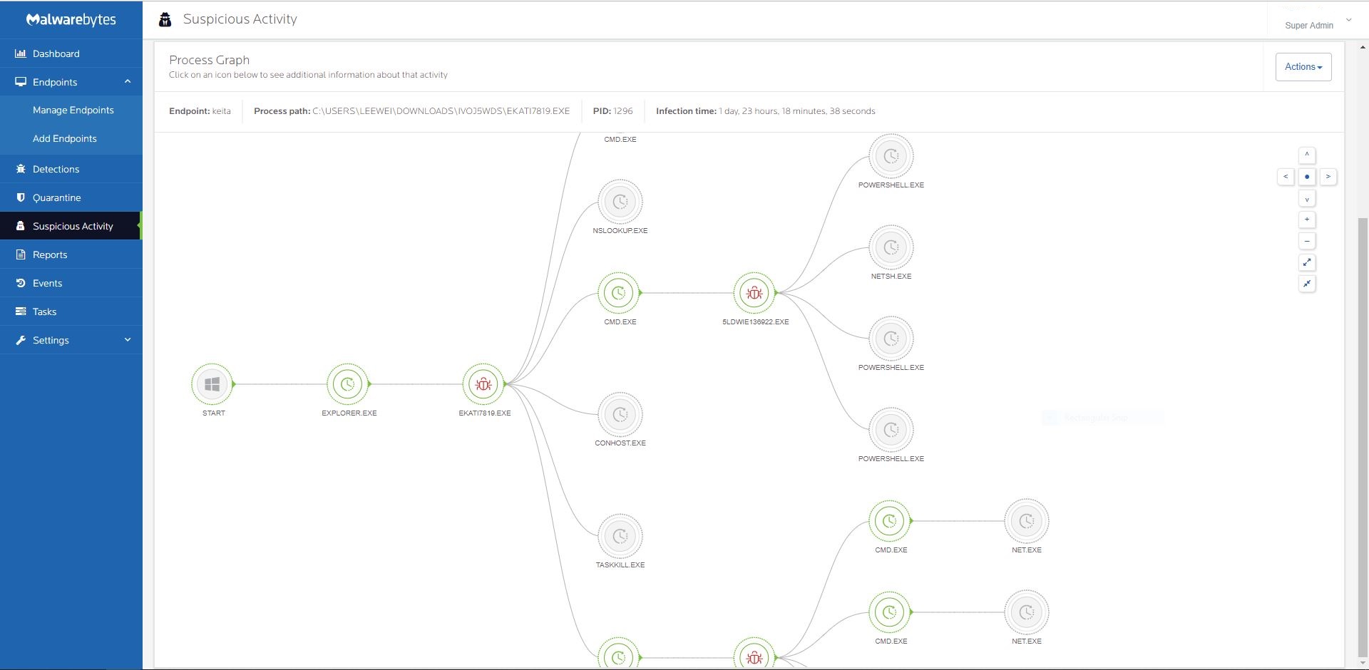 의심스런 활동을 시각화하고 위협 제거의 최상의 경로를 결정하기 위한 멀웨어 행동과 실행 경로에 대한 상세한 프로세스 분석
