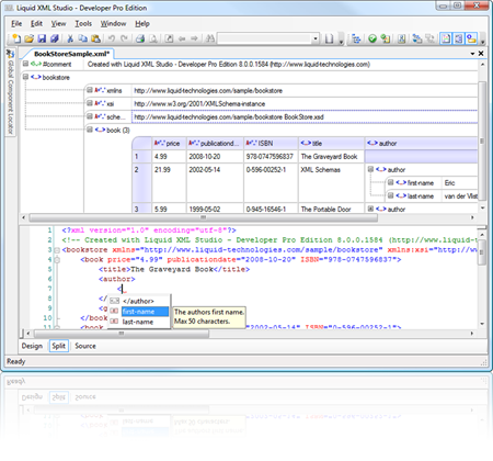 XML Editor는 그리드 보기(Grid View)와 함께 XML 소스코드를 표시하는 분할 보기 모드(Split View Mode)에서 사용할 수 있습니다. 그리드 보기의 변경 사항은 코드 보기(Code View)에