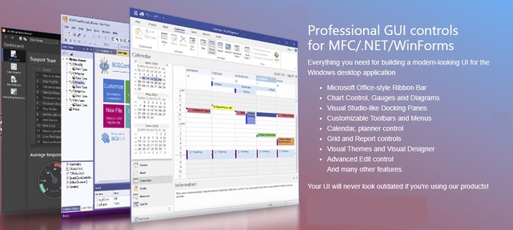 BCGSuite for MFC는 100개 이상의 철저히 설계되고 테스트된 MFC 확장 클래스로 구성된 스위트입니다. 이 스위트에는 Grid 및 Report 컨트롤, Chart, Gauges, Planner(아웃룩 스타일 캘린더), Gantt Control, IntelliSense가 포함된 고급 에디트 컨트롤, Syntax Highlighting 및 향상된 DWM 지원 또는 스킨 대화 상자 및 폼과 같은 많은 컨트롤 및 기능이 있습니다. “BCGSuite for MFC”는 Visual C++ 2008 Feature Pack 1 이상을 대상으로 합니다.