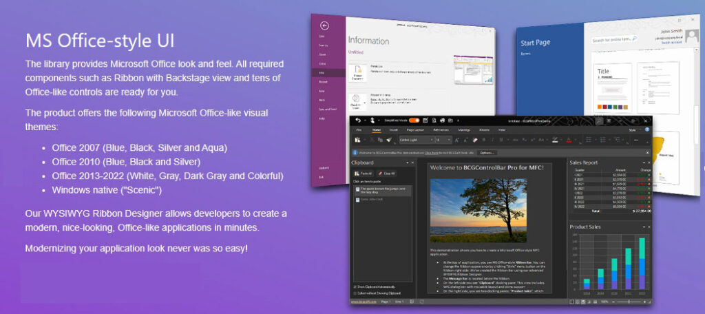 BCGControlBar Pro for MFC는 MFC 확장 라이브러리로, Microsoft Office 및 Microsoft Visual Studio와 유사한 완벽한 사용자 정의 옵션(리본, 사용자 정의 툴바, 메뉴 등)과 차트, 캘린더, 그리드, 편집기, 간트 등과 같은 전문적으로 디자인된 GUI 컨트롤과 함께 마이크로소프트 오피스 및 비주얼 스튜디오와 유사한 애플리케이션을 만들 수 있도록 해줍니다.