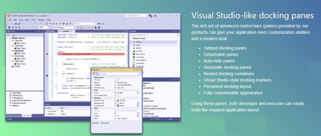 BCGControlBar Library Professional은 리본, 툴바, 메뉴, 컨트롤 등의 300개 이상의 잘 설계된, 테스트된, 문서화된 MFC 확장 클래스를 갖춘 MFC 확장 라이브러리입니다. 이 라이브러리를 애플리케이션에 통합하여 Office 및 Microsoft Visual Studio와 같은 UI를 추가하여 사용자 정의 및 시각화 기능을 제공할 수 있습니다.