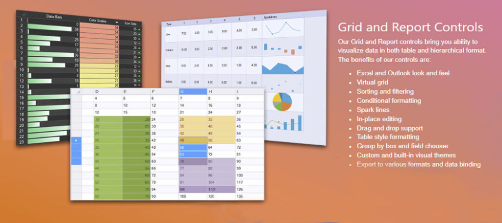 Various cell types: text, numeric, combo box, date/time, color picker, check box and others