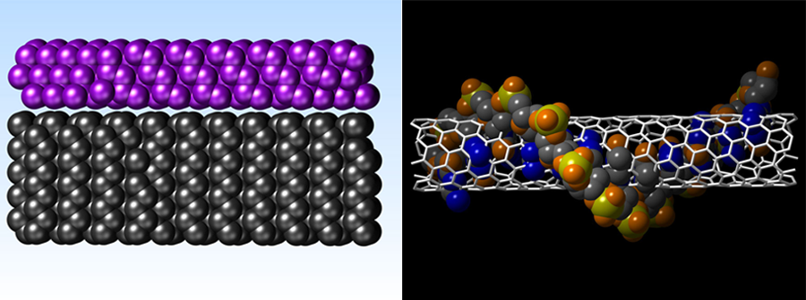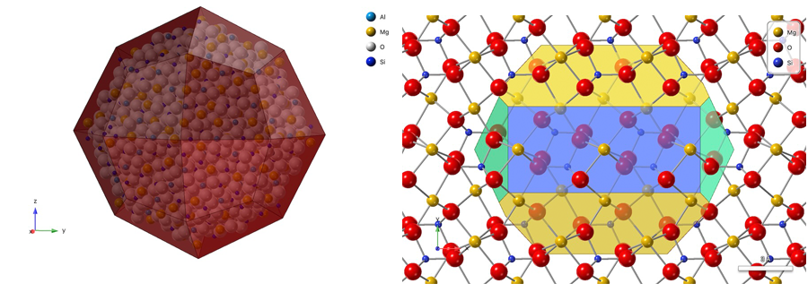 왼쪽: 두 실리콘 결정(111 도메인과 110 도메인) 사이의 경계면. 오른쪽: 서로 다른 두 구조를 같은 창에 모아 크기를 비교한 모습.