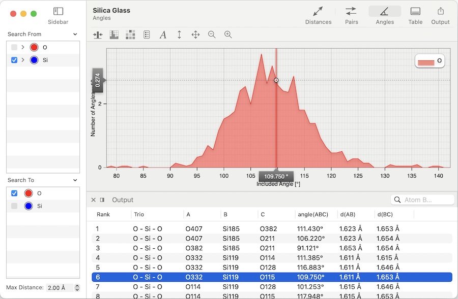 Angles Explorer는 비정질 실리카에서 O–Si–O 결합각의 분포를 보여줍니다.