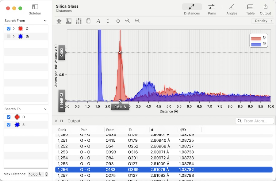 자세한 접착 거리(bond distance)와 각도 정보는 화면에서 확인하거나 텍스트 파일로 내보낼 수 있습니다. 강력한 거리 탐색기(Distance Explorer)를 사용하면 요소(elements)나 사이트 조합을 중심으로 조정 환경(coordination environments)을 그래픽으로 시각화 할 수[비디오 참조] 있습니다. 선택한 요소 쌍(element pairs)에 대한 “부분(partial)” 쌍 분포[비디오 참조] 함수를 볼 수 있는 옵션을 사용하여 X선 또는 중성자 쌍 분포 함수를 시각화 할 수도 있습니다.[비디오 참조]