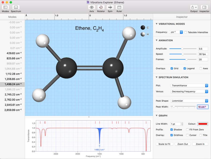 에텐의 진동 모드를 시각화했습니다. 왼쪽에는 허용되는 모든 모드(6개의 영주파수 병진 모드 포함)가 나열되어 있습니다. 선택된 모드는 애니메이션으로 표시되며, 사용자는 진폭, 속도 및 품질(프레임 수)을 조정할 수 있습니다. 애니메이션 모델은 회전 및 크기 조절이 가능하며, 다양한 모델 유형(예: 막대형 보기 또는 공간 채움 보기)으로 볼 수 있습니다. 현재 모드는 화면 하단의 계산된 적외선 스펙트럼에서 강조 표시되어 있습니다.