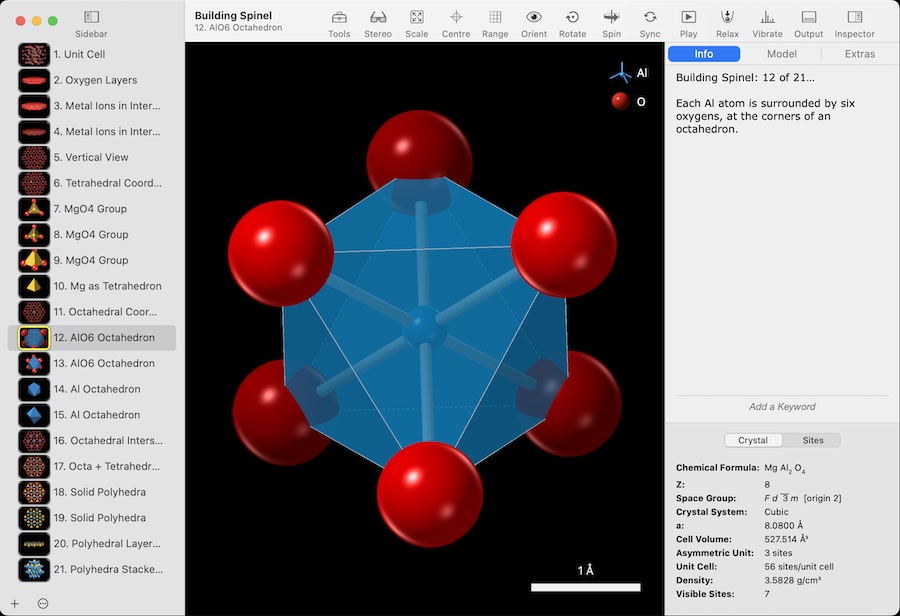 CrystalMaker 문서는 각각의 고유한 그래픽 썸네일이 포함된 다중 구조를 저장할 수 있습니다. 명확한 애플리케이션은 구조적 동작과 애니메이션 용이지만 동일한 구조, 다양한 모델 유형, 원자 범위나 관련 구조의 다양한 보기(views)를 저장할 수도 있습니다. 각 구조에는 고유한 메모가 있으므로 이상적인 교육 도구, 즉 회전이 가능한 완전 대화형 슬라이드 쇼가 상황에 맞게 표시됩니다. 매력적인 교육 컨텐츠를 구축하는 방법에 대한 예제가 프로그램에 포함되어 있습니다(예 : “석영 만들기”, “스피넬(Spinel)” 만들기)