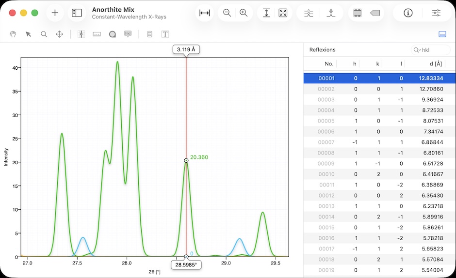 통합 검색(Search) 필드를 사용하면 플롯 패턴이나 반사 목록(Reflections List)에서 시뮬레이션된 반사를 빠르게 찾을 수 있습니다. 목록에서 반사를 탐색하고 정렬할 수 있으며 반사를 두 번 클릭하면 플롯에서 즉시 찾을 수 있습니다. 피크 팁(Peak Tips)은 마우스를 움직일 때 반사를 식별하는데 도움이 됩니다. 팀은 확장 가능하여 d-간격, 상대 강도와 너비를 포함하여 각 피크에 대한 전체 정보를 표시합니다.