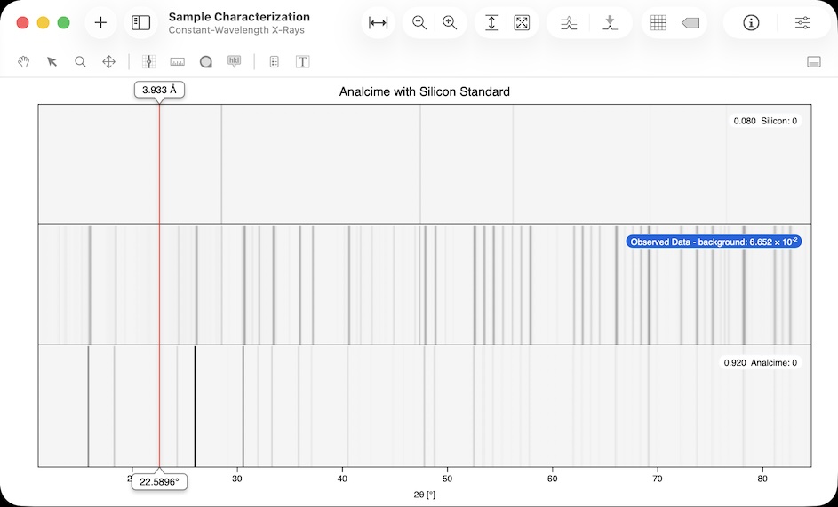 CrystalDiffract를 사용하면 시뮬레이션 데이터와 비교하기 위해 여러 실험 데이터 세트를 가져올 수 있습니다. 텍스트 파일을 회절 창으로 끌어 놓기만 하면 됩니다. 관찰된 데이터를 조작하고 크기를 조정하고 실시간 평활화(smoothing )와 배경 보정(background corrections)을 적용한 다음 혁신적인 화면 도구를 사용하여 관찰된 패턴을 측정할 수 있습니다. 시뮬레이션 된 패턴과 비교하여 순도를 확인하거나 위상 식별 합니다.
