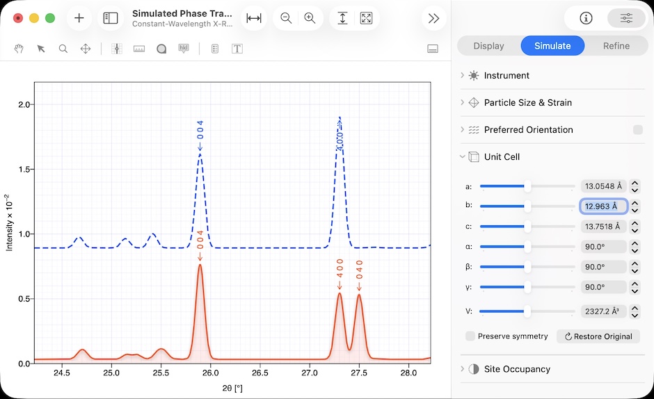 사방정계(파란색 그래프)에서 사방정계(빨간색 그래프)로 위상 전이를 시뮬레이션합니다. 단위 셀 매개변수를 바로 편집하여 피크 분할이 어떻게 변하는지 확인할 수 있습니다.